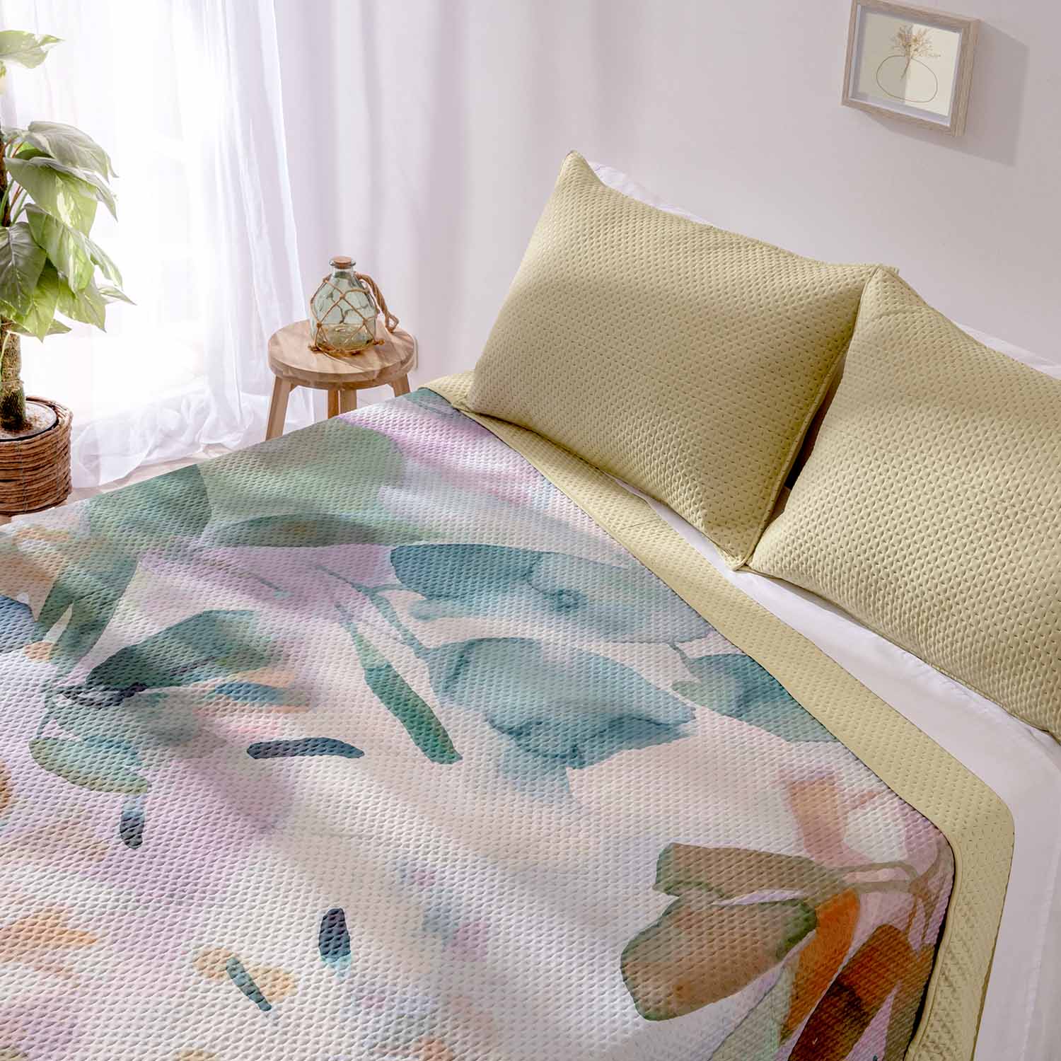 Una colcha ligera, suave y funcional que aporta confort y un estilo actual al dormitorio.