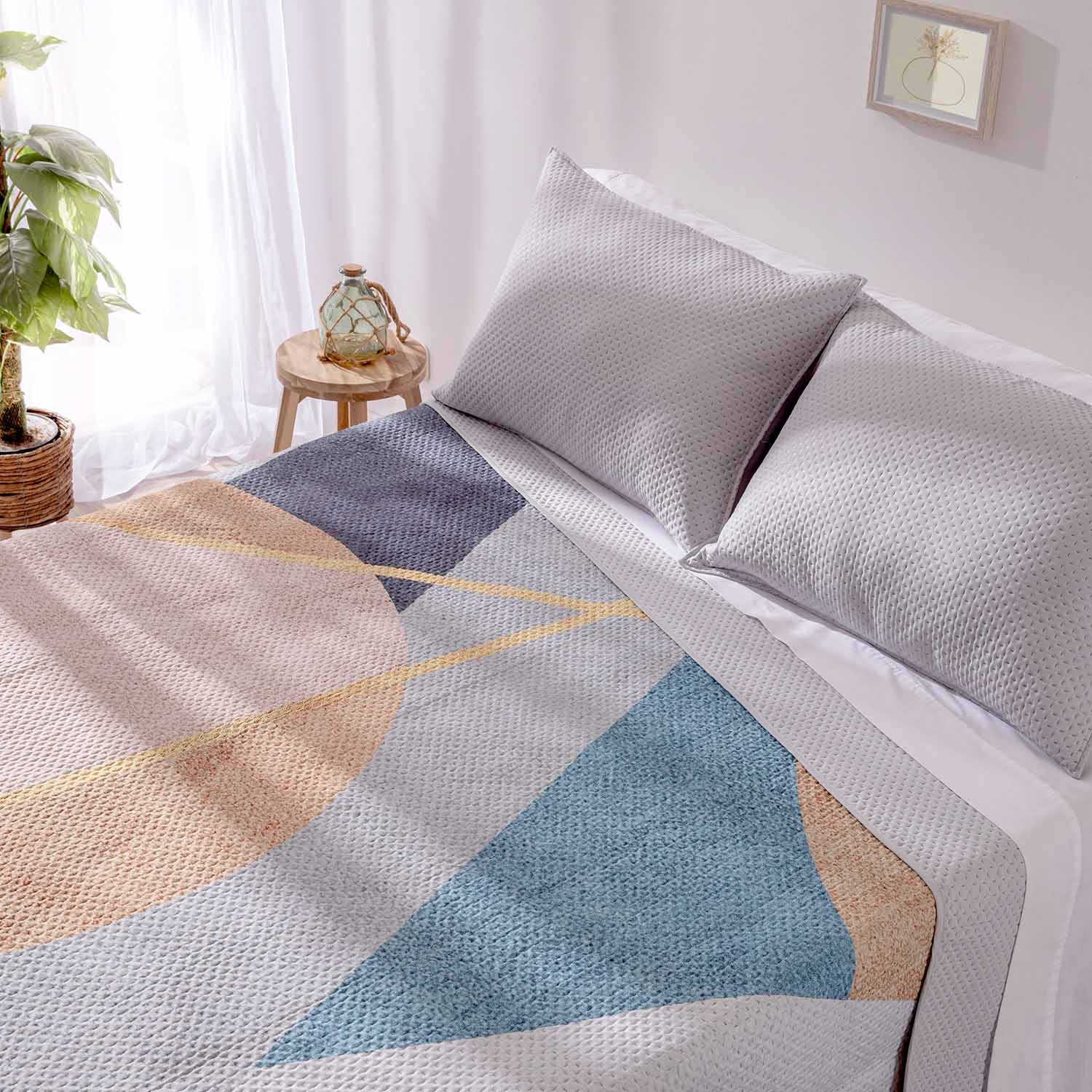 Una colcha ligera, suave y funcional que aporta confort y un estilo actual al dormitorio.
