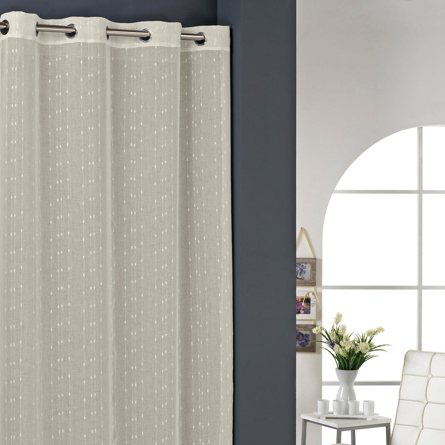 Cortina Alba, confeccionada en tejido poliéster. Con ojales metálicos para su instalación en barra fija. Da un toque de elegancia a tu hogar, permitiendo el paso de la luz.