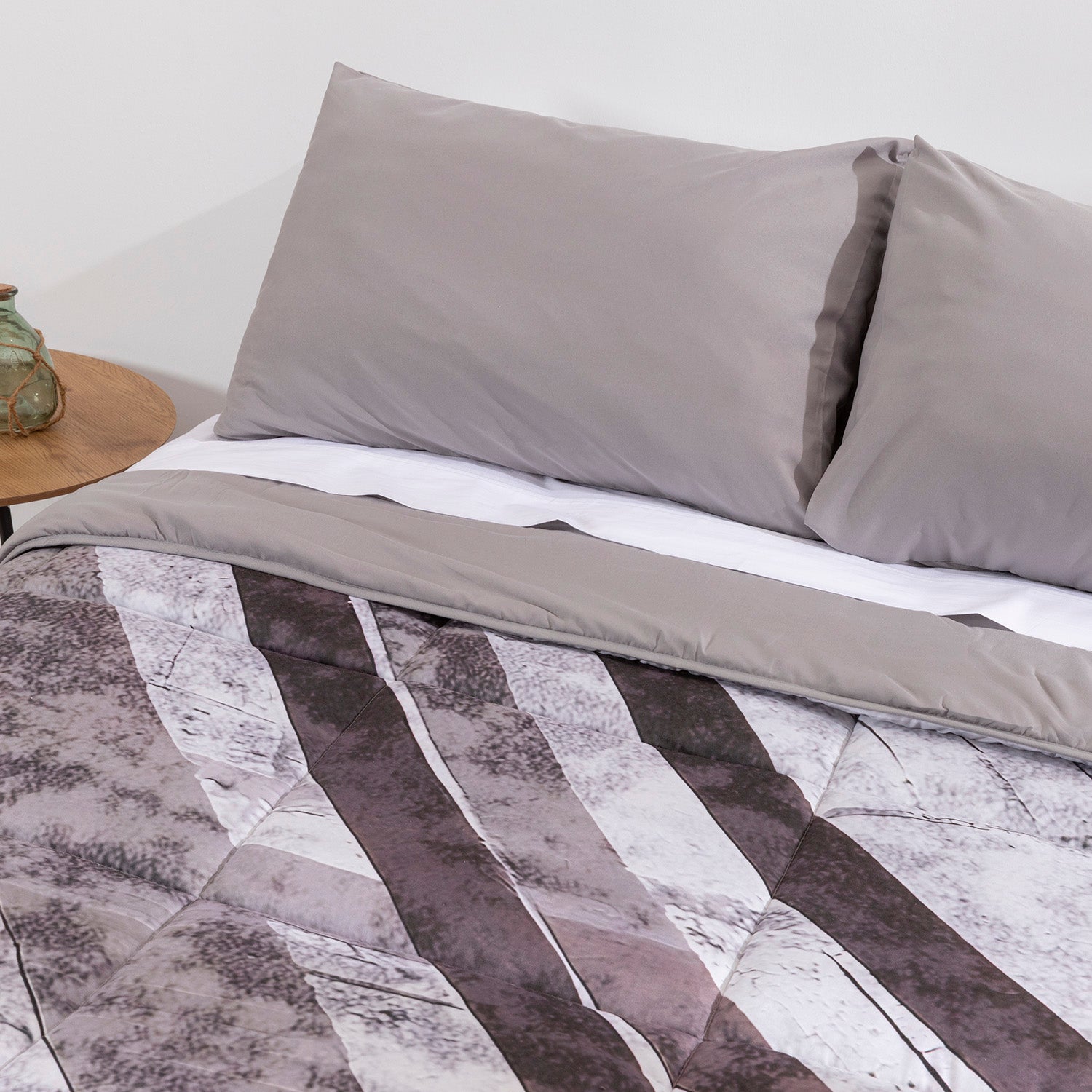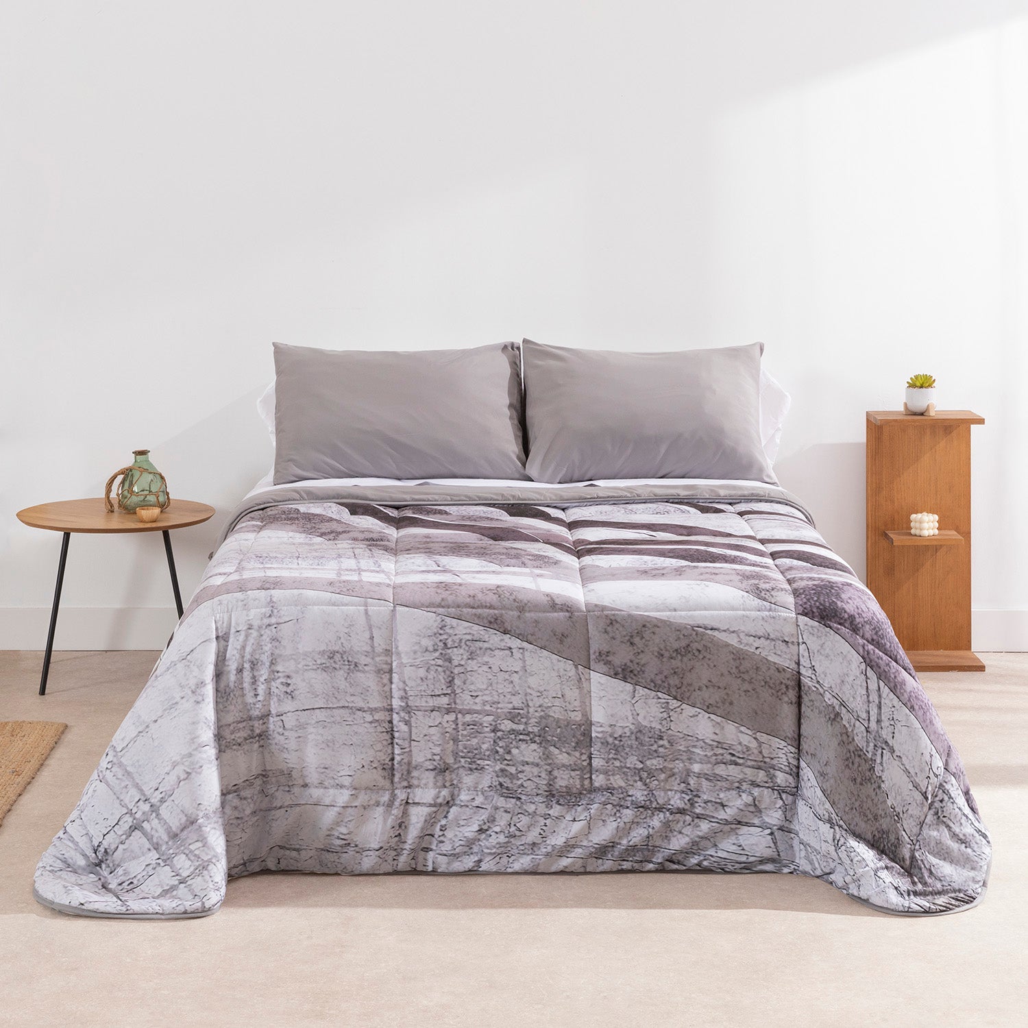 El Edredón Karamelo Confort Digital Keijo es un edredón de invierno que combina diseño contemporáneo, calidad textil y un alto nivel de confort. Su elegante diseño geométrico en tonos grises y marrones, realizado mediante estampado digital de alta definición, aporta un acabado nítido y decorativo que viste la cama con estilo y personalidad.