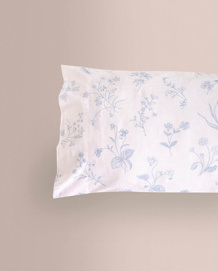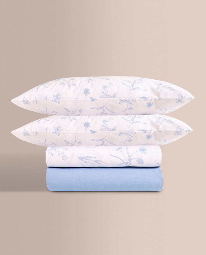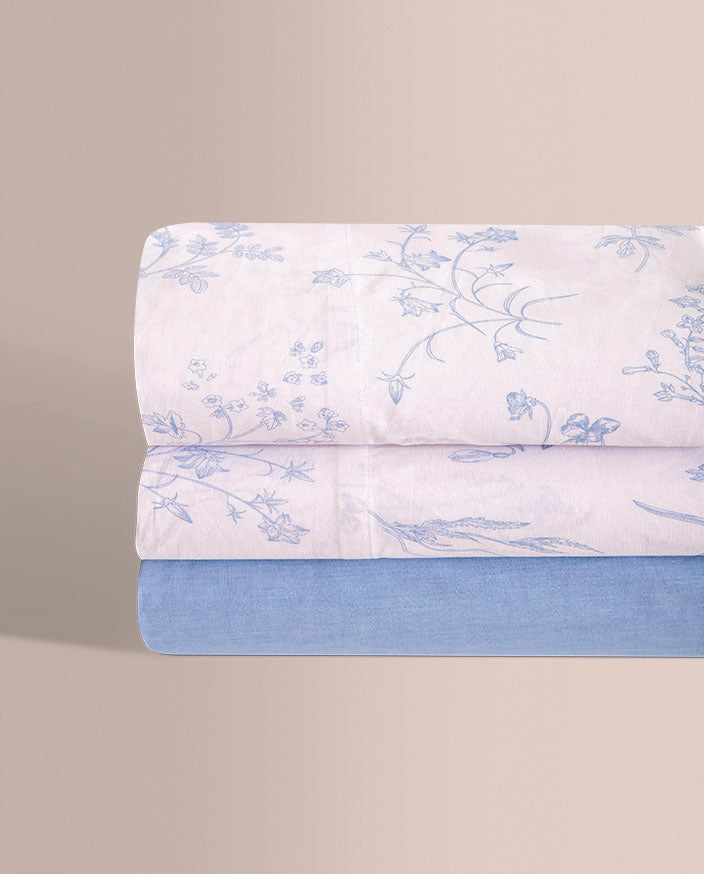 El conjunto presenta un estampado en tono azul, elegante y fácil de combinar, acompañado de una sábana bajera ajustable en color liso, perfectamente coordinada para lograr un acabado armonioso y práctico.