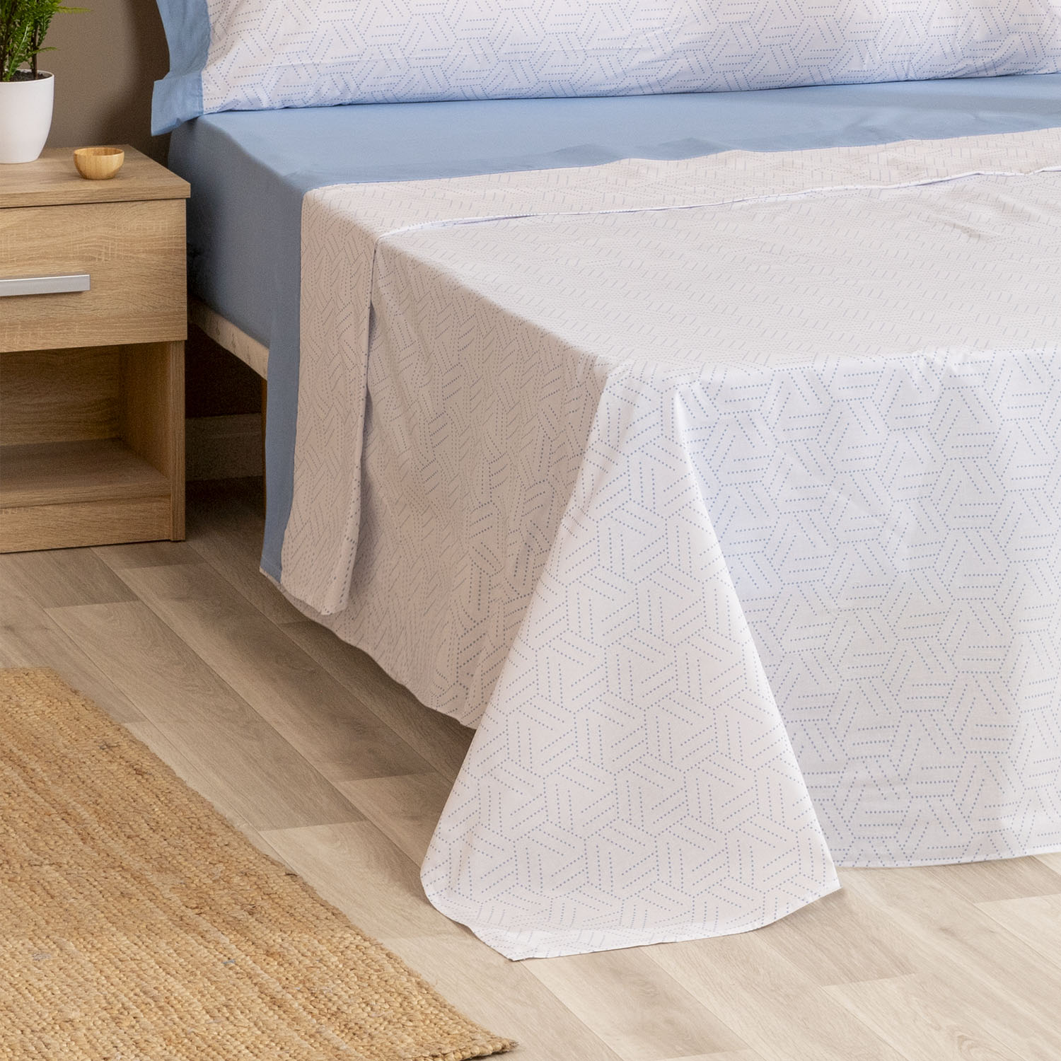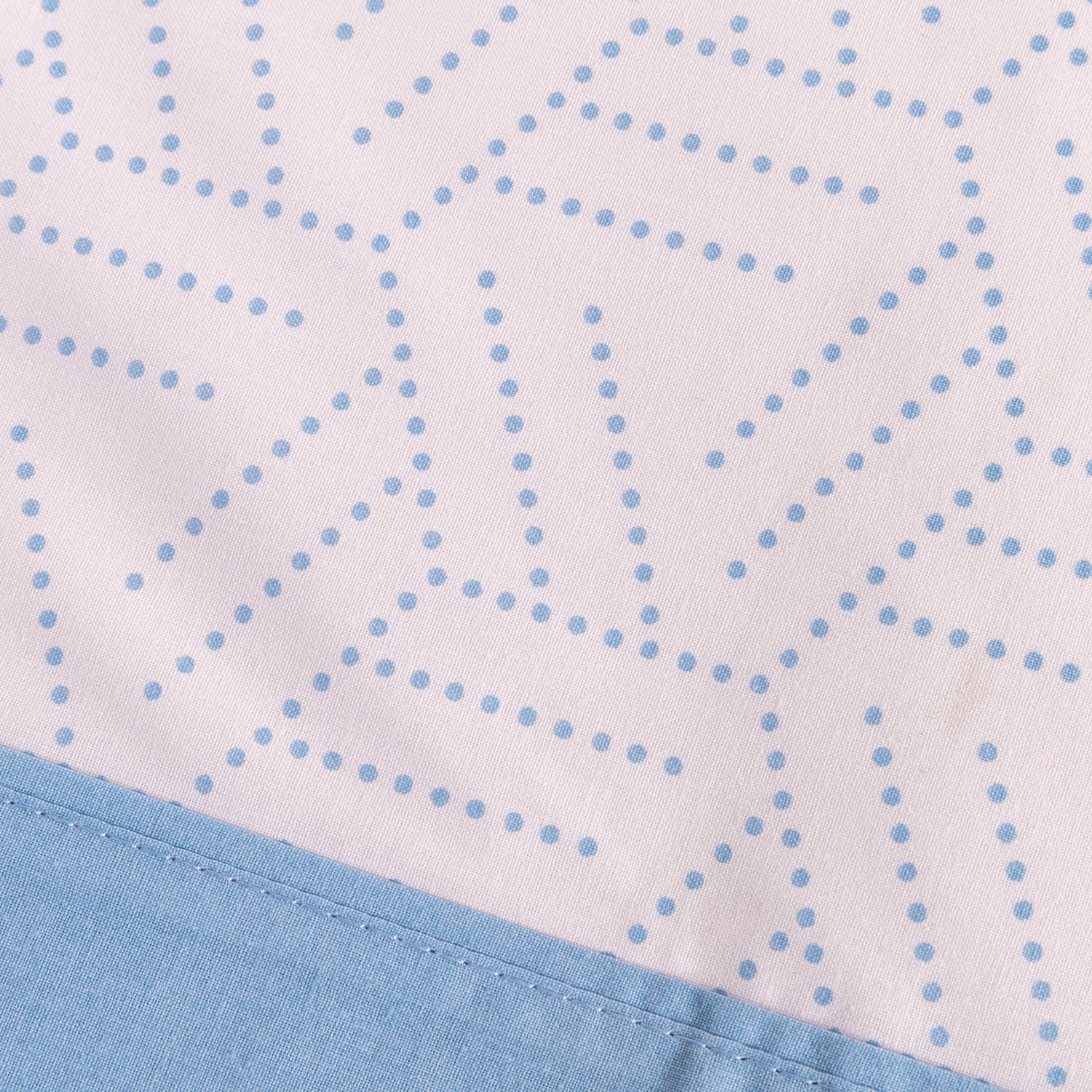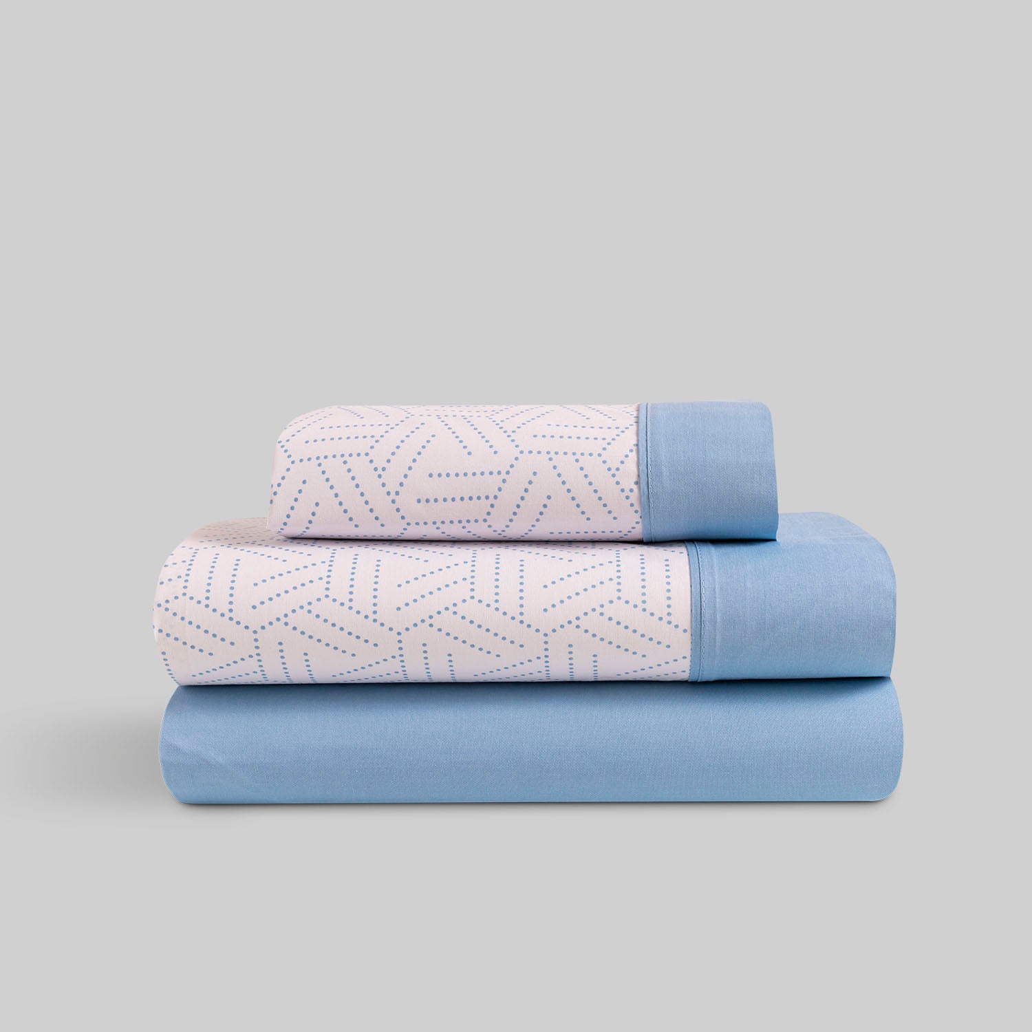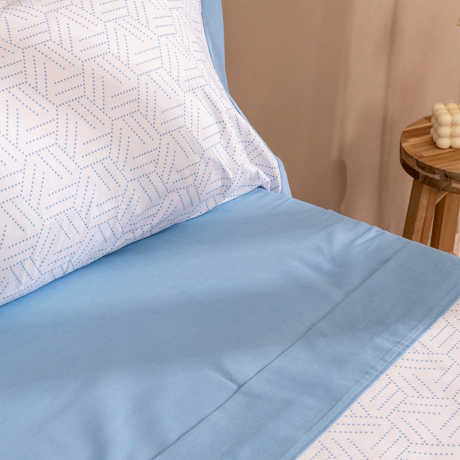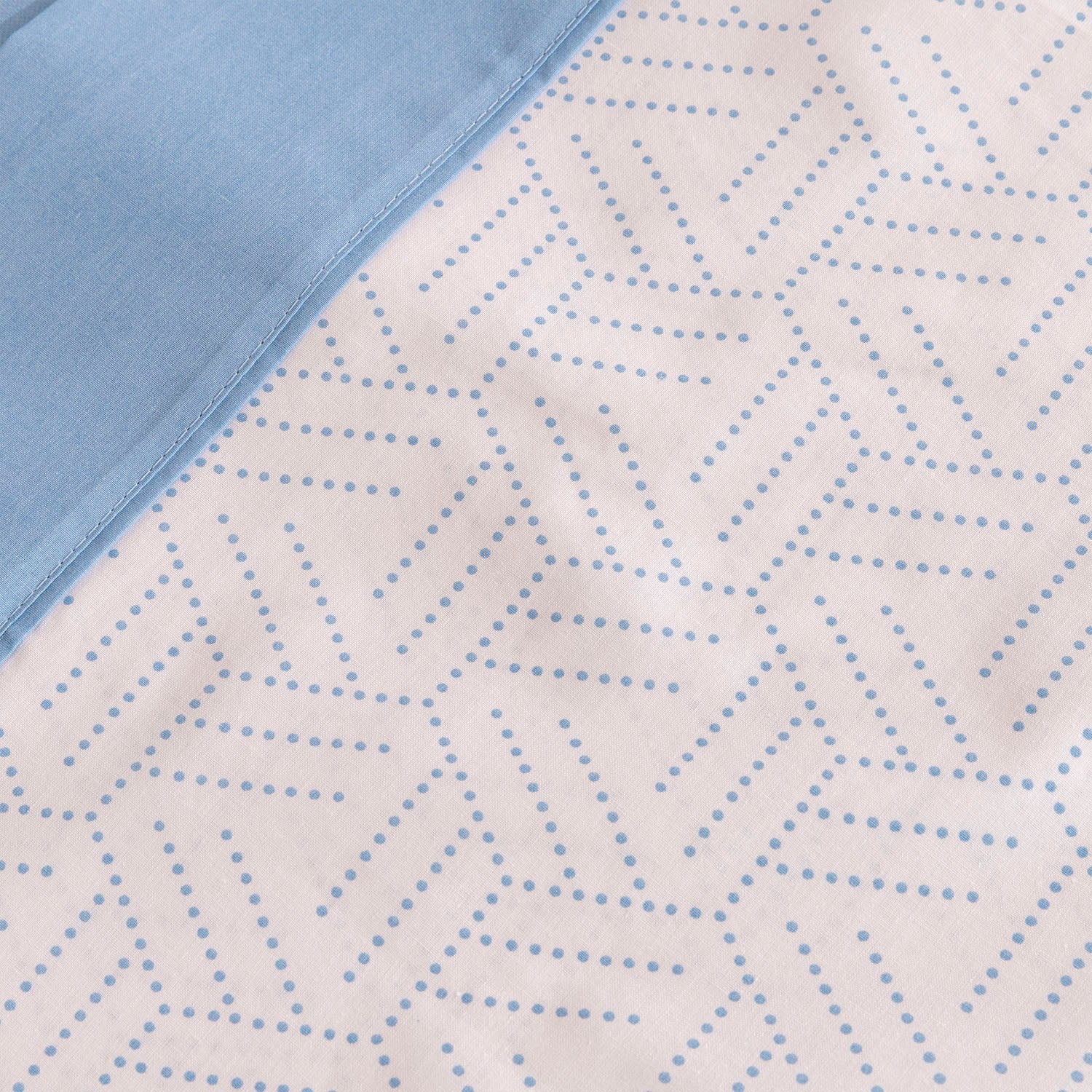 Si buscas una habitación que transmita calma y frescura, el Juego de Sábanas Taru en color celeste es la elección perfecta. Su estampado de líneas geométricas punteadas sobre fondo blanco aporta un toque moderno y ligero, mientras que la bajera en azul celeste completa un conjunto equilibrado y luminoso.