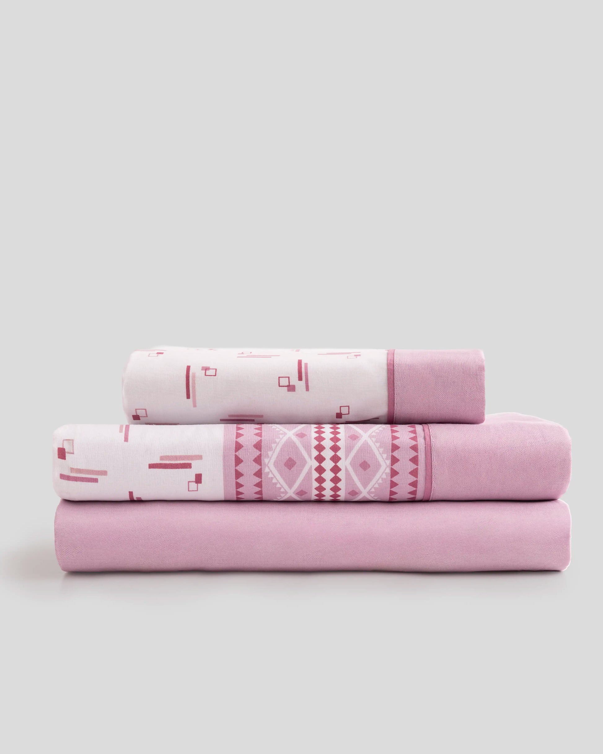 Renueva tu dormitorio con la energía y el estilo geométrico del Juego de Sábanas Lalia. Este modelo destaca por su diseño contemporáneo de inspiración étnica, que combina patrones de rombos y triángulos en una franja central coordinada con un estampado minimalista de líneas y cuadrados en el cuerpo de la sábana. Es la opción ideal para quienes buscan un ambiente moderno, ordenado y con una personalidad única.