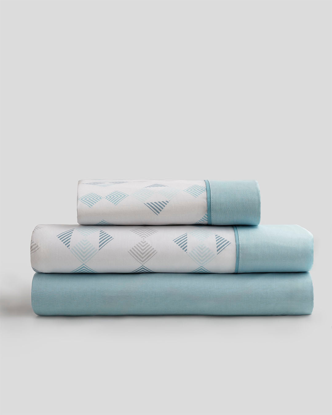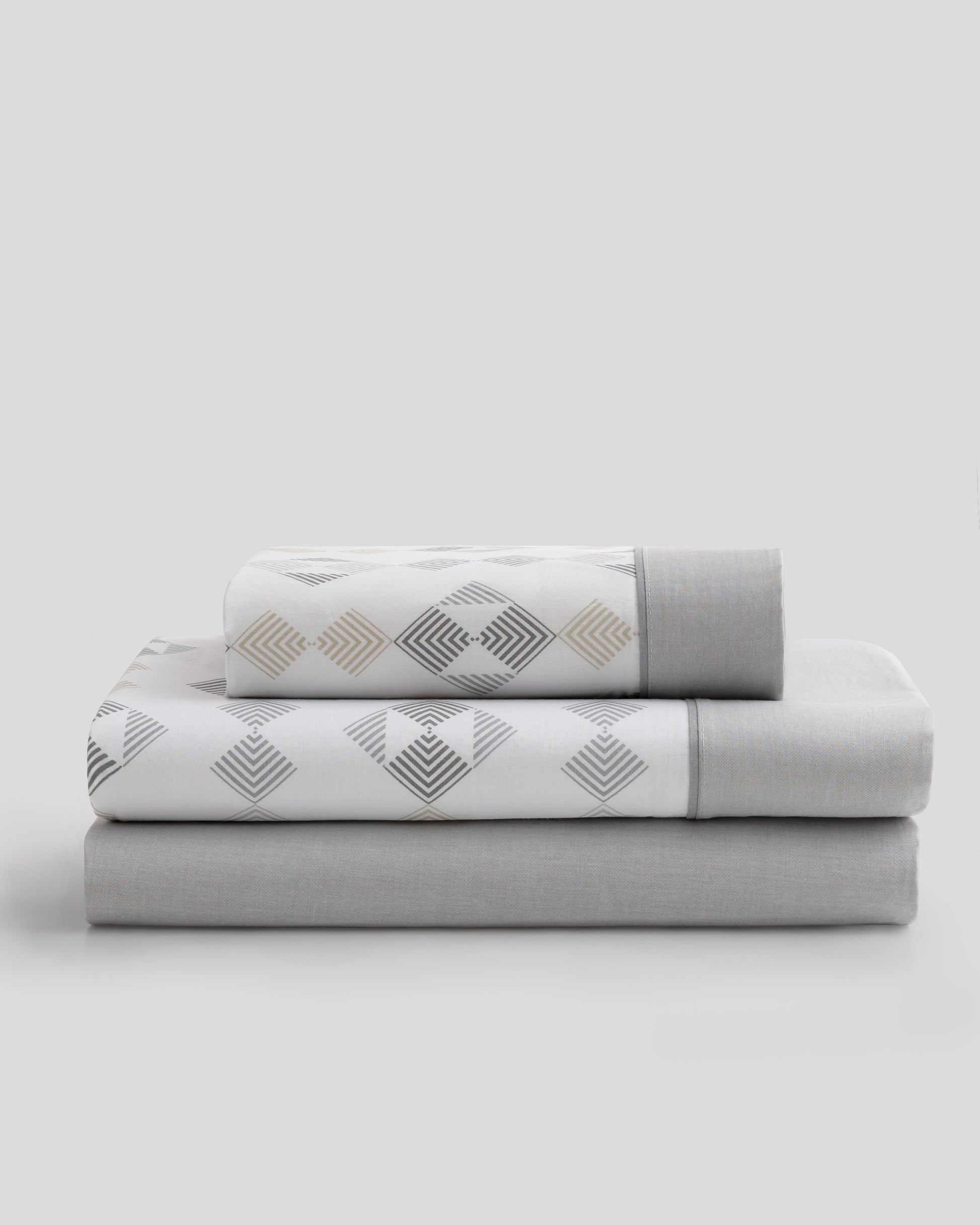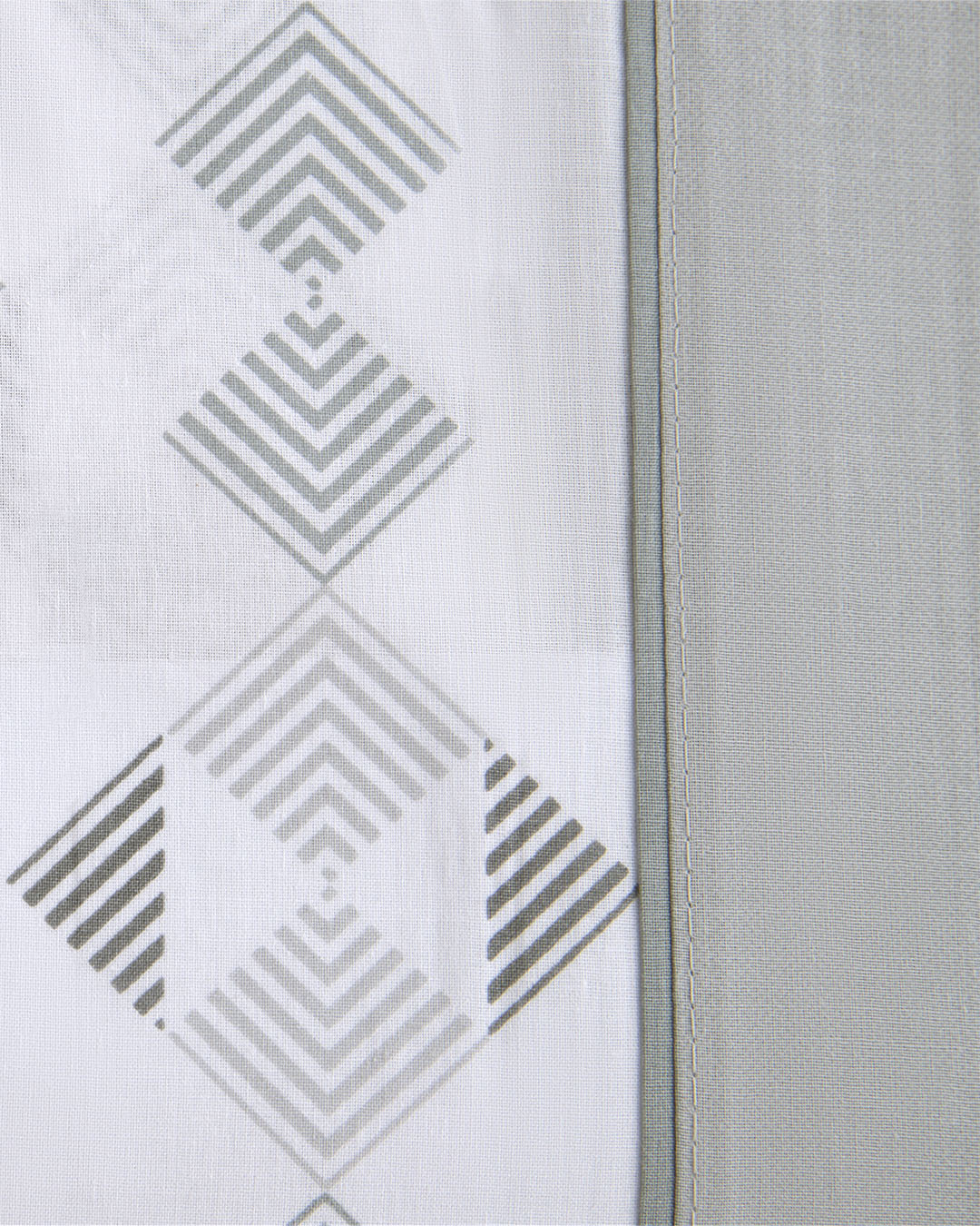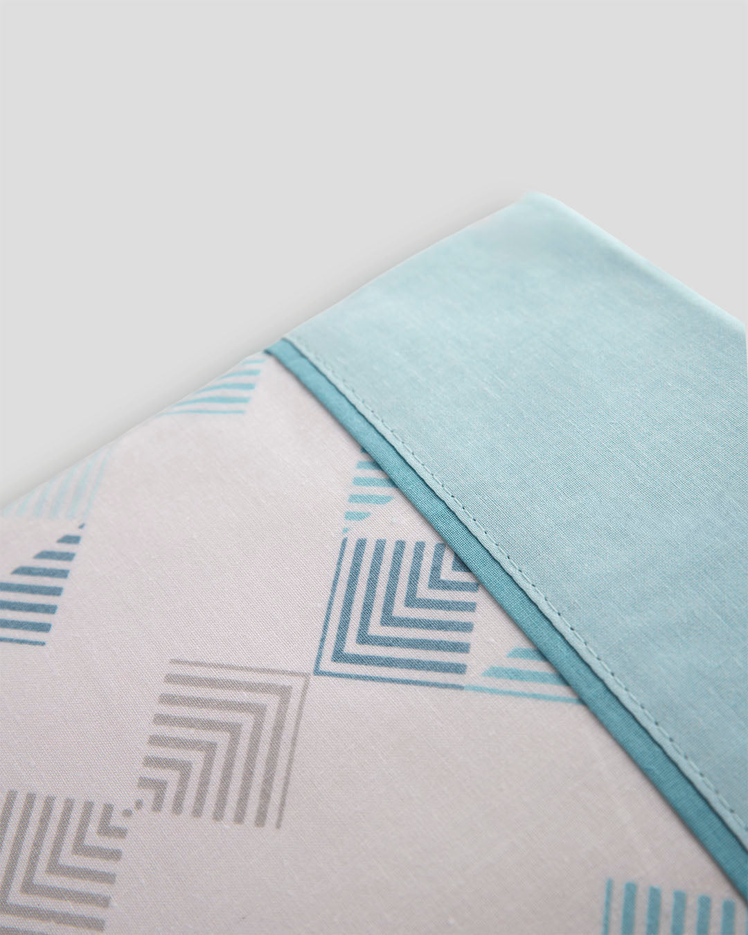 Diseño Geométrico con Vivo: La encimera cuenta con un elegante embozo aplicado de 10 cm con vivo, un detalle decorativo que se repite en las fundas de almohada para un conjunto totalmente coordinado.