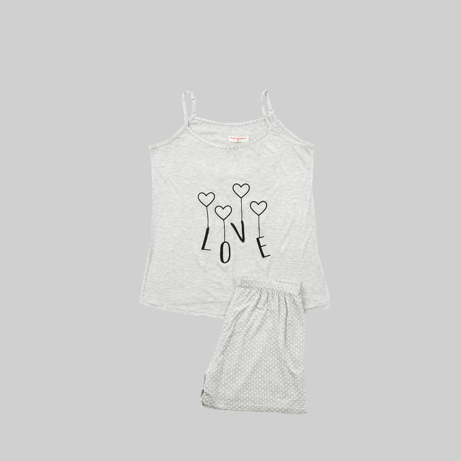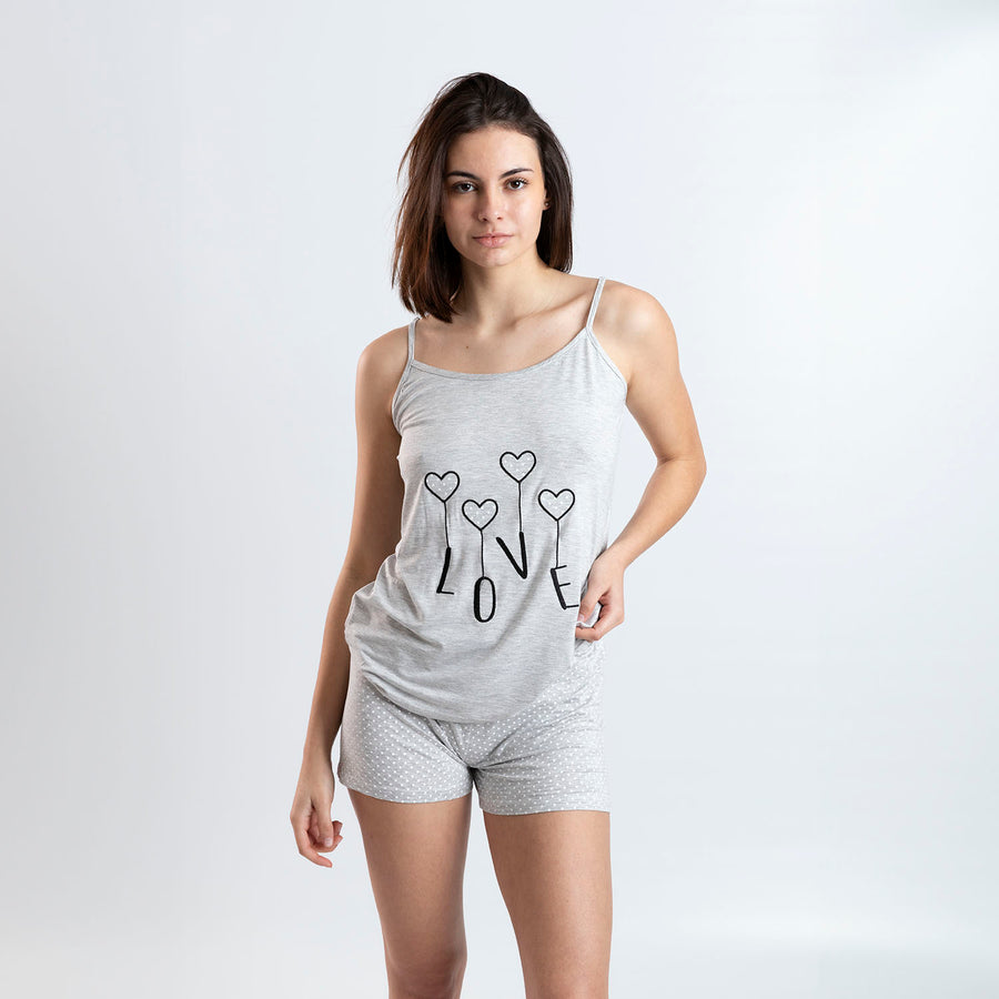 Pijama de mujer con tirantes finos en tono gris. Confeccionado en tejido ligero y suave, ideal para las noches más cálidas. Su diseño fresco y cómodo lo convierte en una opción perfecta para el verano.